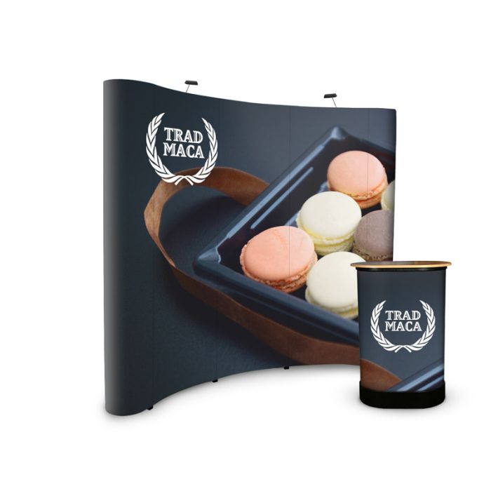 Gebogenes Faltdisplay Curved Plus (früherer Name "READY Plus") als Pop-Up Display, welches innerhalb von wenigen Minuten zu einer großen Messewand aufgebaut wird. Das Messesystem wird inkl. bedruckbarem Transportkoffer und 2 x Spotlightstrahler geliefert.