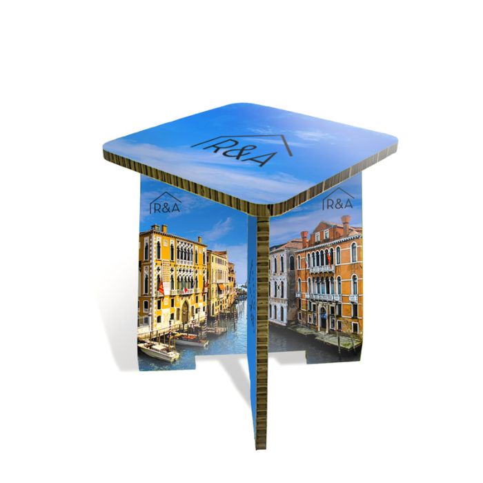 Zusammensteckbarer Hocker, 100% recycelbar (ohne Umleimer). Auch mit edlen Kantenabschlüssen als weiße Umleimer erhältlich.