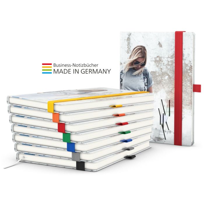 Ausstattung: Hardcover mit Einband Cover-Star gloss-individuell, auf Wunsch ohne Mehrpreis: matt-individuell, Natura braun oder individuell, unwattiert Buchblock und Decke mit abgerundeten Ecken. cremefarbenes Schreibpapier 90 g/m². Gummiband und Stiftschlaufe gelb, grün, mittelblau, orange, rot, schwarz, silbergrau oder weiß. Einstecktasche, Lesezeichen, Kapitalband, runder Rücken
