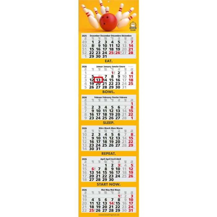 Verarbeitung: Kalenderblocks einzeln perforiert ·Rückwand zweiteilig geklebt und zum fünf- oder sechs- maligen Falten gerillt · Blockhalter-Stanzung · Aufhängeöse aus Metall