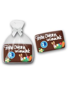 Bedrucken Sie ganz einfach Ihre Grußkarte als Anhänger, eine Schachtel in der das Ostergebäck verpackt ist, oder die günstigen Flowpacks als Plastiktütchen mit Gebäckstück darin eingeschweißt. Mit farbigem Firmen-Aufdruck lässt sich die Leckerei schnell veredeln und als Werbeartikel einsetzen. Das Ostergebäck lässt sich auf ganz verschiedene Weisen mit Ihrer Werbung bedrucken, und macht zu günstigen Preisen einen süßen Eindruck.